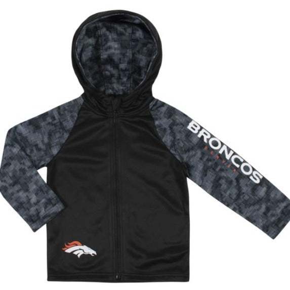 Cool weather won't keep that team pride under wraps with this toddler boys' officially licensed Denver Broncos hooded jacket! Your future MVP will enjoy the soft, comfy feel of the 100% poly surgent fleece. It keeps him warm and cozy when the game plan calls for time outdoors. The snug hood offers protection from the elements That bold Broncos logo features prominently in screenprint on the front of the jacket. His team loyalties will be on proud display any time he dresses out. Machine wash and dry cleaning makes laundry day simpler for busy moms!