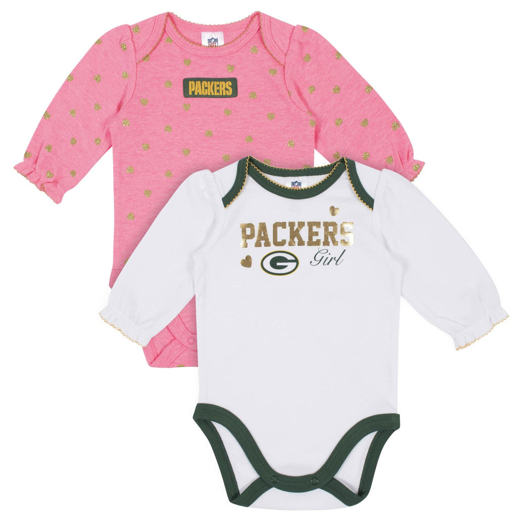 She'll be all set to watch the best team in the league take to the field with this 2-pack of baby girls' officially licensed Green Bay Packers long sleeve bodysuits! This set is an ideal choice for instilling team loyalty early on! Shimmery foil with shiny picot highlights the Packers team logo. The comfortable cotton/poly blend interlock provides a warm, cozy fit. The higher-in-the-front bottom snap closure keeps diaper changes short. Dressing her out is easier with the expandable lap shoulder neckline. On laundry day, the machine wash and dry fabric saves mom time!