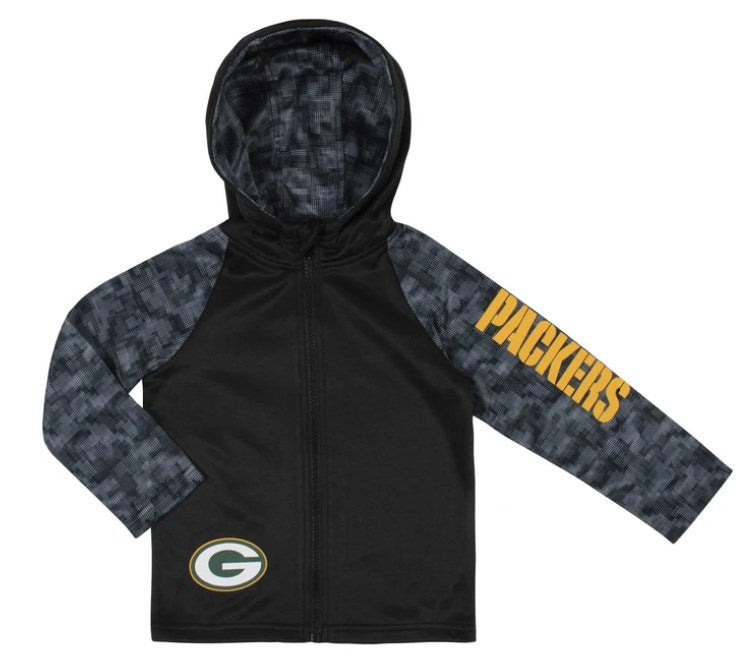 Cool weather won't keep that team pride under wraps with this toddler boys' officially licensed Green Bay Packers hooded jacket! Your future MVP will enjoy the soft, comfy feel of the 100% poly surgent fleece. It keeps him warm and cozy when the game plan calls for time outdoors. The snug hood offers protection from the elements That bold Packers logo features prominently in screenprint on the front of the jacket. His team loyalties will be on proud display any time he dresses out. Machine wash and dry cleaning makes laundry day simpler for busy moms!