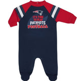 From the kickoff to the final seconds spent running down the clock, this baby boys' officially licensed New England Patriots Sleep N' Play provides the perfect outfit for enjoying all of the game day fun! The Patriots logo stays in the forefront via the screenprint with puff details. The cozy cotton blend interlock provides a warm, cozy feel for cheering on a touchdown pass or romping around during commercial breaks. The front zipper opening makes it easy for mom to change diapers during halftime. When it's time to hit the lockers, the machine wash and dry fabric keeps clean up simple.