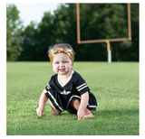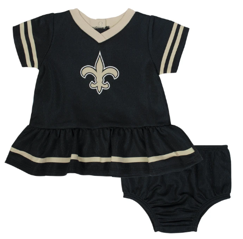 This baby girls' officially licensed New Orleans Saints cheerleader dress and matching panty set won't leave anybody wondering who she's pulling for on game day! The 100% poly dazzle mesh and rib fabrics keep her feeling her best as she cheers on her favorite football team or gets ready to launch out on an everyday adventure. The Saints logo is a standout on the dress with bold screenprint artwork and team colors showing proudly. There's never a need to pamper this outfit when laundry day arrives. Just toss it into the washer and dryer with the rest of the easy care items!